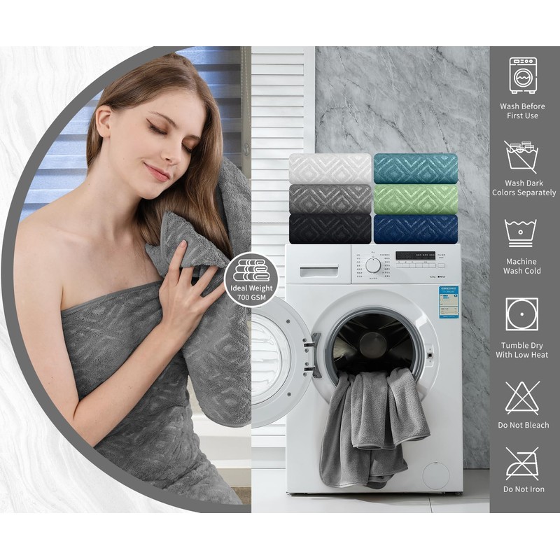 - CARE INSTRUCTIONS:wash before use,Machine wash in cold,Tumble dry low,Do not iron,towels can absorb 10 times their weight in water makes quick drying large surface ,This towel can be washed and reused hundred of times which remain soft after multiple wash and dry cycles.