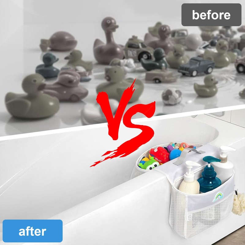 - Practical and convenient net design: storage of toys in the bath. Use a towel or paper towel to wipe the water from the edge of the bath. The large capacity of the mesh design is suitable for storing children's toys, duck toys, bath toys and so on. Keep your bathroom clean and tidy. Two independent pocket designs, convenient for classified storage of bath toys