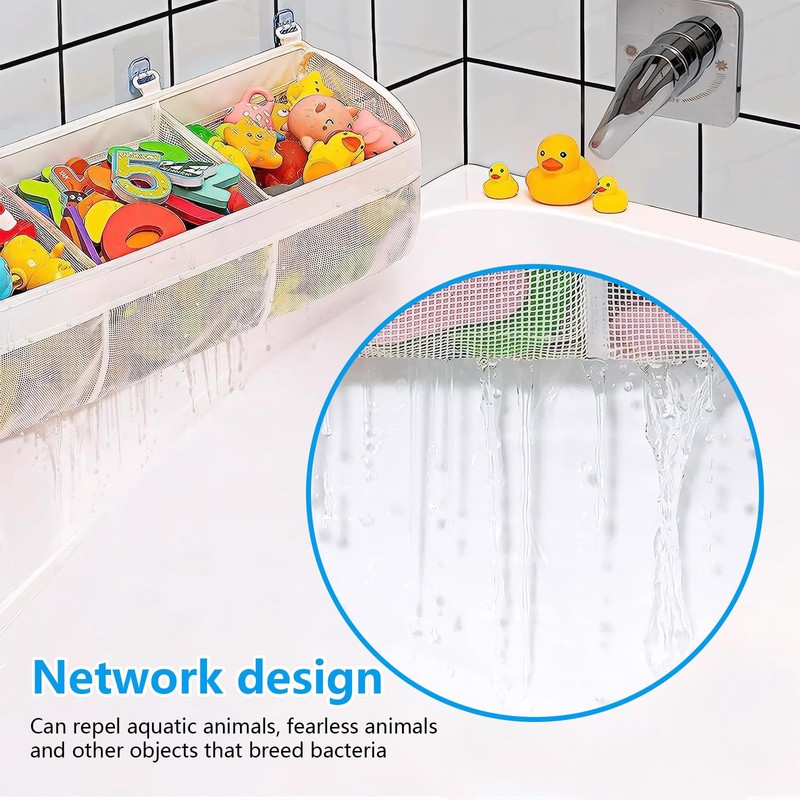 - What Do You Get: You will receive one bath toy holder mesh bag and 4 double hook closures, bathtub toy tidy hanging organiser bag features a spacious pocket design with 3 separate compartments and 2 side pockets, which can easily organize and classify toys,toy storage organizer is built to last. storage bet bag with robust stitching and strong adhesive hooks made of premium stainless steel, you can trust that your toy storage solution will remain secure and functional over time
