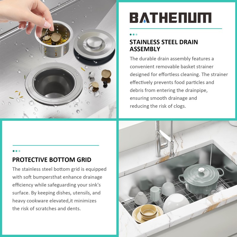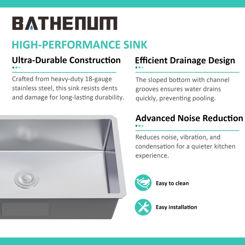 Bathenum 30-inch Undermount Single Bowel Kitchen Sink, Handmade 16 Gauge Stainless Steel Kitchen Sink 30” x 18" Deep Sink with Drain Kit and Bottom Grid, Brushed