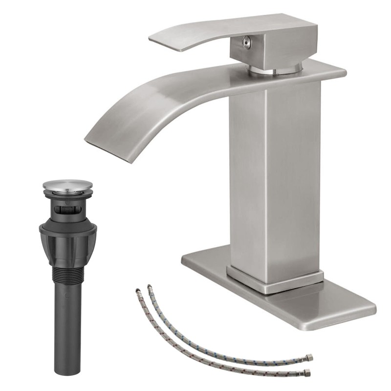 BATHLAVISH Bathroom Sink Faucet Waterfall Brushed Nickel Single Hole Modern with Pop Up Drain with Overflow Vanity Lavatory Single Handle Brush Mixer Tap Deck Mounted