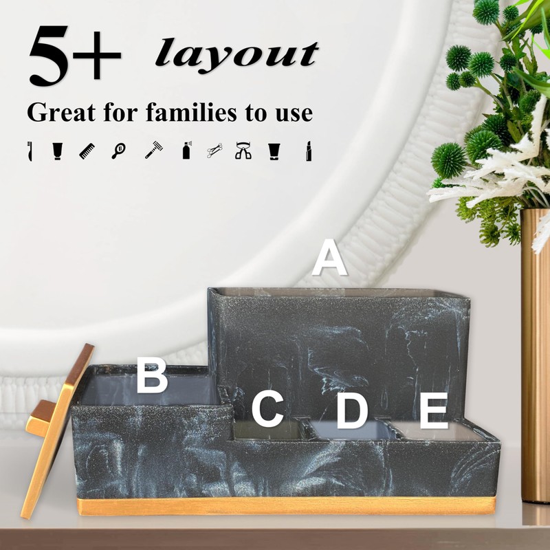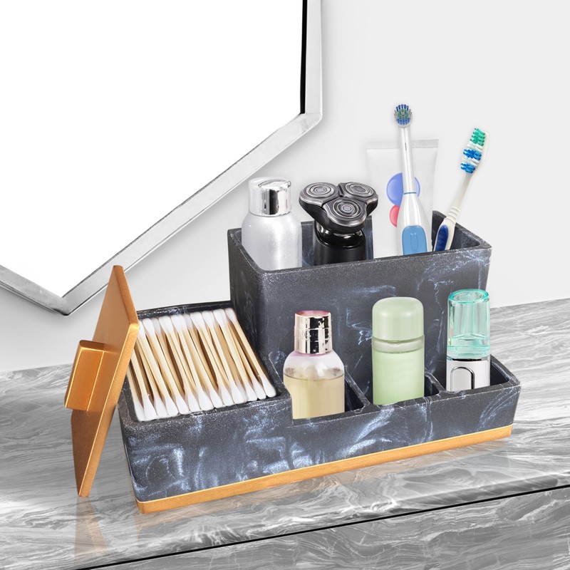 Bathroom Countertop Organizer with Lid, Large Size Toothbrush Holder Organizer, Bathroom Vanity Storage with Lid for Cotton Ball, Cotton Swab, Floss, Resin in Black Marble and Metalic Gold