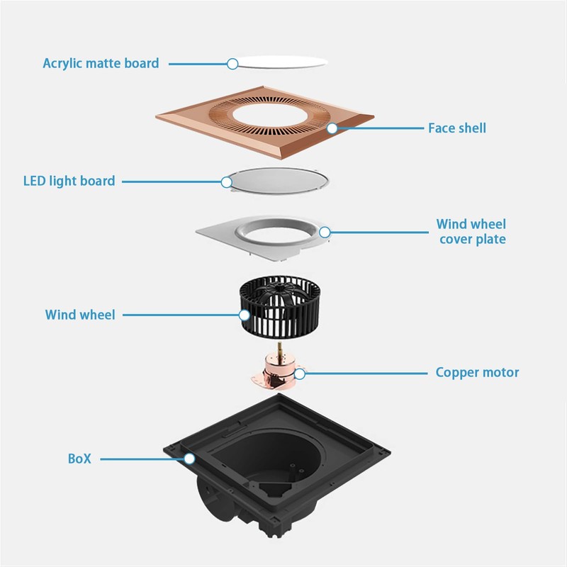 - Low Noise & Large Ventilation: The bathroom exhaust fan with light uses a copper wire sealed motor with strong wind power. Large size wind wheel, large ventilation and high exhaust volume. The fan runs at a noise level of 1.2 Sones. The fan impeller cooperates with the high-speed rotating motor to stably output 165CFM air volume, quickly removing moisture and odor in the room.