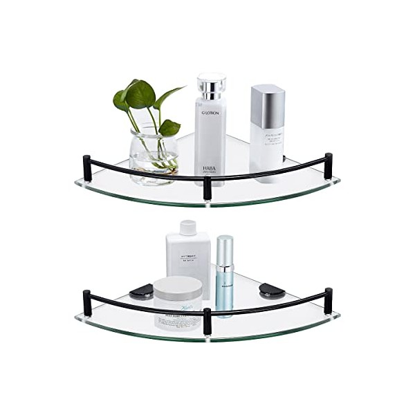 • 🔥[Corner Glass Shelves with Rail] The bathroom shelves is easy to clean, its stainless steel bracket and polished chrome finish rail ensuring the high quality costruction and excellent fastness,This corner shelf with rail which protects your goods from falling down from the shelf easily.