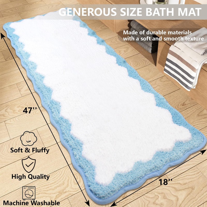 Bathroom Runner Rugs Non Slip 18" x 47" Luxury Microfiber Soft Long Scalloped Rug Cute Blue and White Bath Mat Fun Bathroom Rugs Washable Absorbent Funky Irregular Shaped Rug for Bedroom Aesthetic