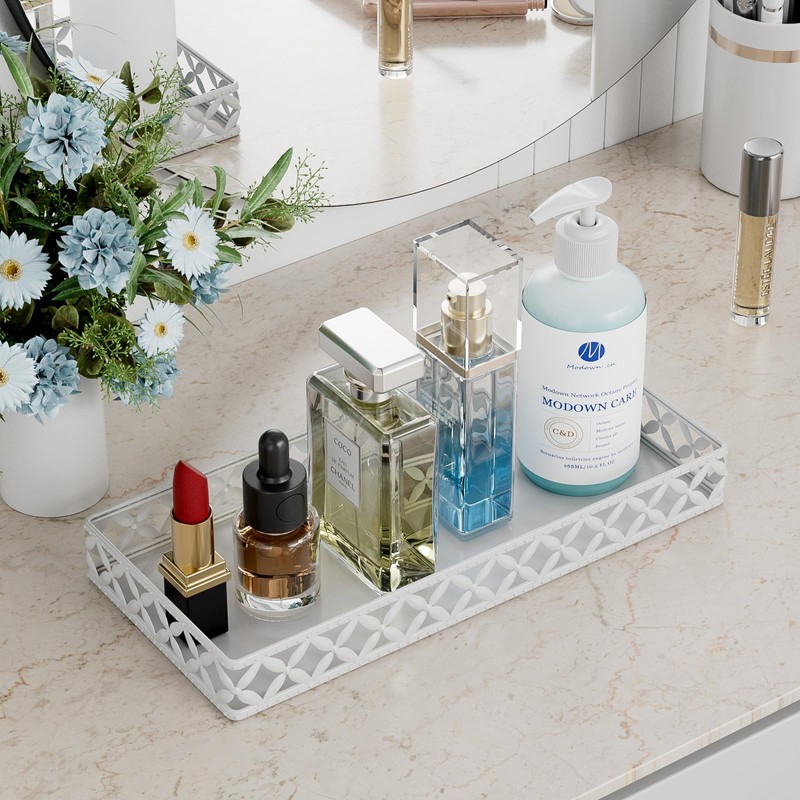- [11 Inch Metal Tray] The 11-inch medium size is suitable for bathroom, dressert, toilet, laundry, living rooms and more. As makeup tray to hold perfum,cosmetics, skincare; bathroom vanity tray holds cotton swabs, guest hand towel and lotion bottles, toothpaste cup; hold spice seasoning bottles, food jars by kitchen counter.
