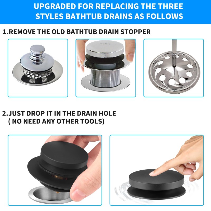 - Versatile Compatibility- The Uxoz Universal bathtub drain stopper & plug is rigorously tested by professionals and is compatible with most tub drains , including lift-and-turn, tip toe, and trip lever drains. You can replace these three different sizes of rubber rings according to the size of your bathtub drain hole, to ensure a perfect fit for your 1.5'' to 1.72'' tub drains.