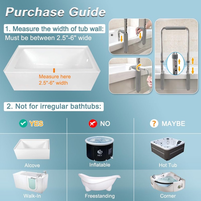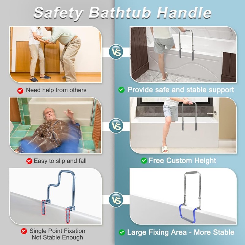 - 【Bathtub Safety Grab Bar】The wide clamping area ensures that bathtub rail is tightly clamped on the side of bathtub, no drilling is required, safe and reliable. Shower grab bar width adjustment range is 2.5-6 inches,suitable for most standard bathtubs. Note: not applicable to fiberglass showers.