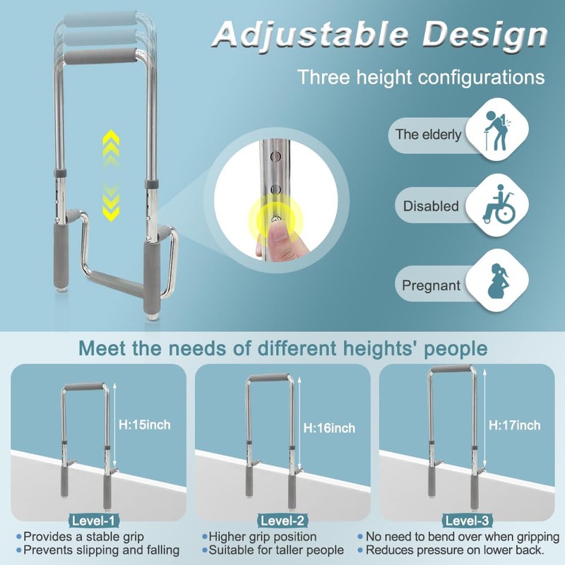 - 【Adjustable Tub Clamp Rail】Bathtub safety rails height can be adjusted from 15 to 17 inches according to your needs. The flexible height is easy to grip for seniors, avoid pain caused by bending over when getting in and out of the bathtub.