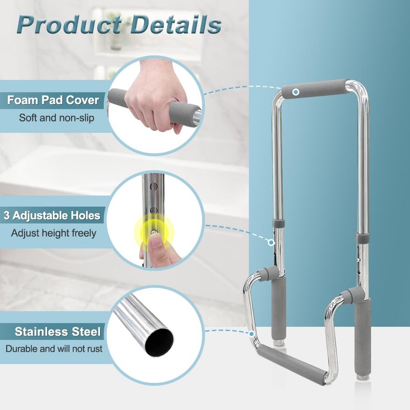- 【Stability & Non-slip】Grey non-slip foam pad on the bottom of the tub clamp bar further stabilizes the grip rod and protects the bathtub from ugly scratches. The bathtub rails is covered with sponge, soft and comfortable, it is easy to grip.