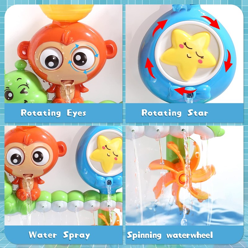 • FUN BATH TOY The star can be rotated by pouring water into the right side of the bath toy, and the water flows out of the star hole. When the child pours water on the right side of the bath toy, the eyes of the monkey can be turned and the water also flows out of the hole. By constantly adding water, several holes in the caterpillar can spray water to form a beautiful waterfall, and rotate with the windmill