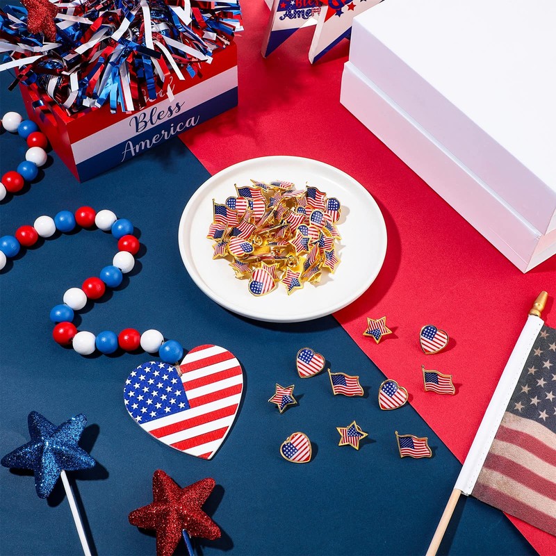 - What You Get: there are 120 pieces of American flag lapel pins in the package, they have 3 different shapes, including national flag, star and heart shapes, which are beautiful and exquisite, can serve you for a long time