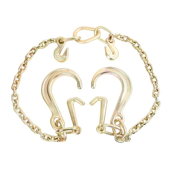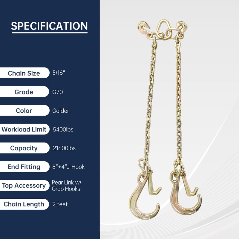 BATONECO 5/16" X 2' G70 V-Chain Bridle w/ 8" and 4" J Hooks, 2 feet (24 inch) Legs Towing Chain, Grade 70 Standard Length, 5,400lbs WLL for Flatbed Truck Wrecker Carrier Transport Tie Down Binder