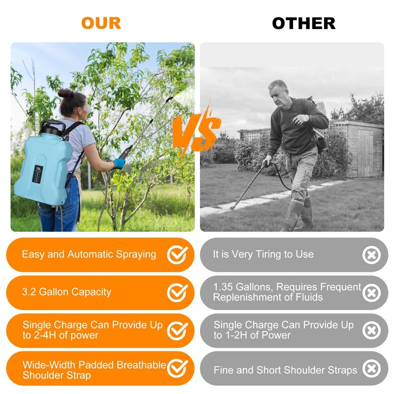 - 【Easy Operation Pump Sprayer】Simply press the button for instant, continuous spray – no manual pumping required. This pump sprayer 2.1 gallon, features include a transparent tank with level markings, quick-detach nozzles for easy cleaning, USB rechargeability, and a lightweight design for comfortable handling, superior to traditional garden sprayers pump.