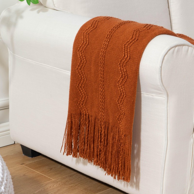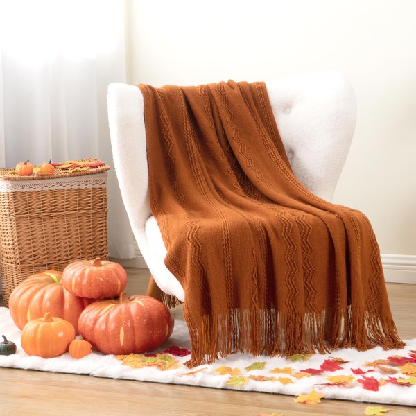 BATTILO HOME Caramel Throw Blanket Geometric Pattern Indoor Outdoor Knitted Throws for Sofa Couch Chair Bed Fall Decor 50"x60"