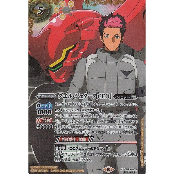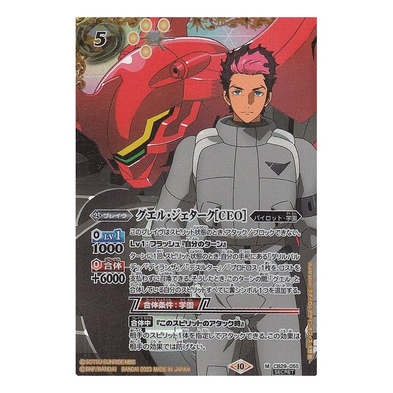 - ★Battle Spirits Collaboration Booster "Gundam Witch Date" (CB28) Record ■Card Name: Guel Jeturk [CEO] ■ Rarity: Secret ■ Type: Brave ■ Cost: / Reduction symbol: / Yellow/ ■Lv Cost: ◆ Symbol: Yellow
