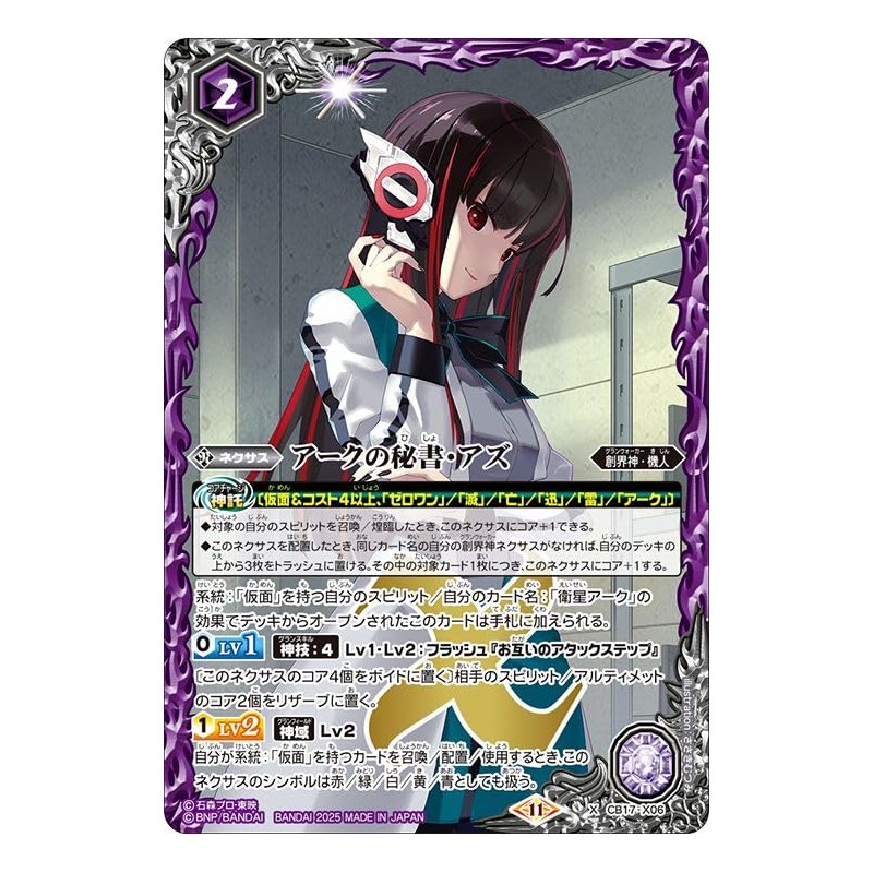 - ★Battle Spirits Collaboration Booster "Kamen Rider Choice of Good and Evil" (CB34) Recorded ■Card Name: Ark's Secretary Azu ■Rarity: X Rare ■Type: Nexus ■Cost: 2 / Reduction Symbol: 0 / Purple / Founder / Planet ■Lv Cost: (0) Lv1 (1) v2 ◆<<< Kamen & Co