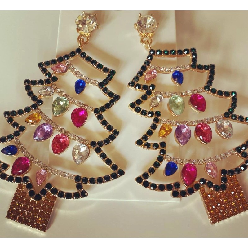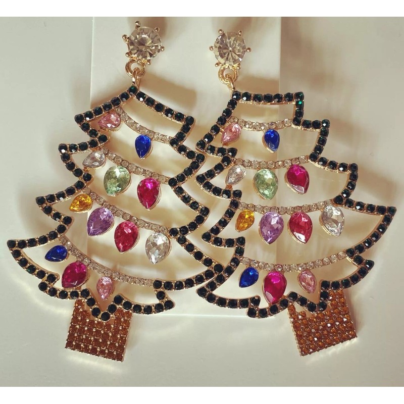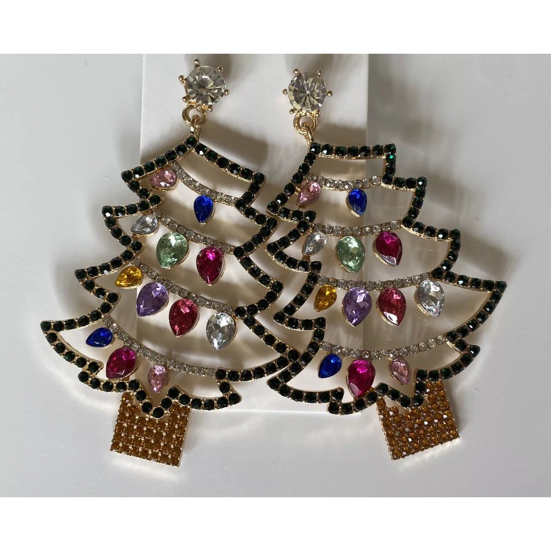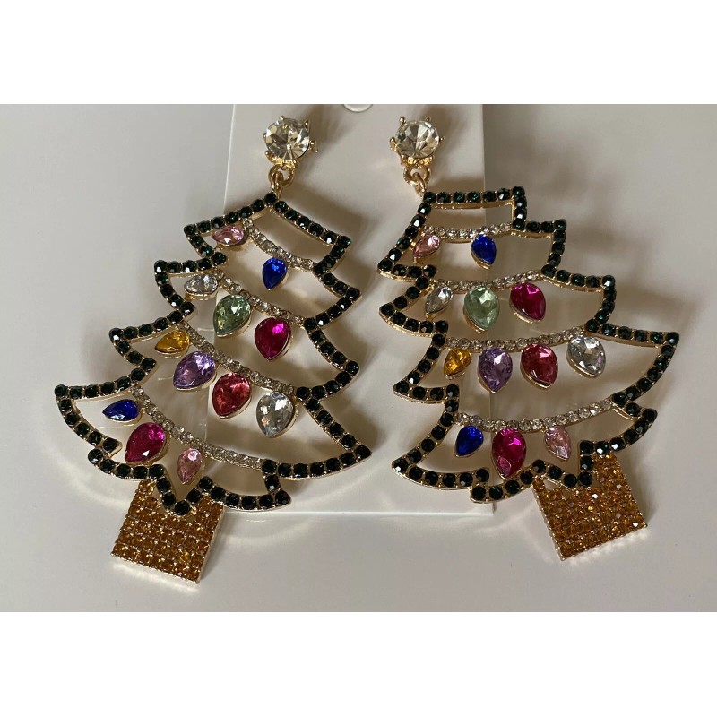 Oh, Christmas Tree! These beautiful earrings feature a large single cubic zirconium stone at the post with a deep green outlined tree with multicolored gemstone lights. Goldtone with stainless steel posts. 1.3 oz. 3 3/8 inches in length, 2.25" wide. These will come in unbranded packaging and are brand new.