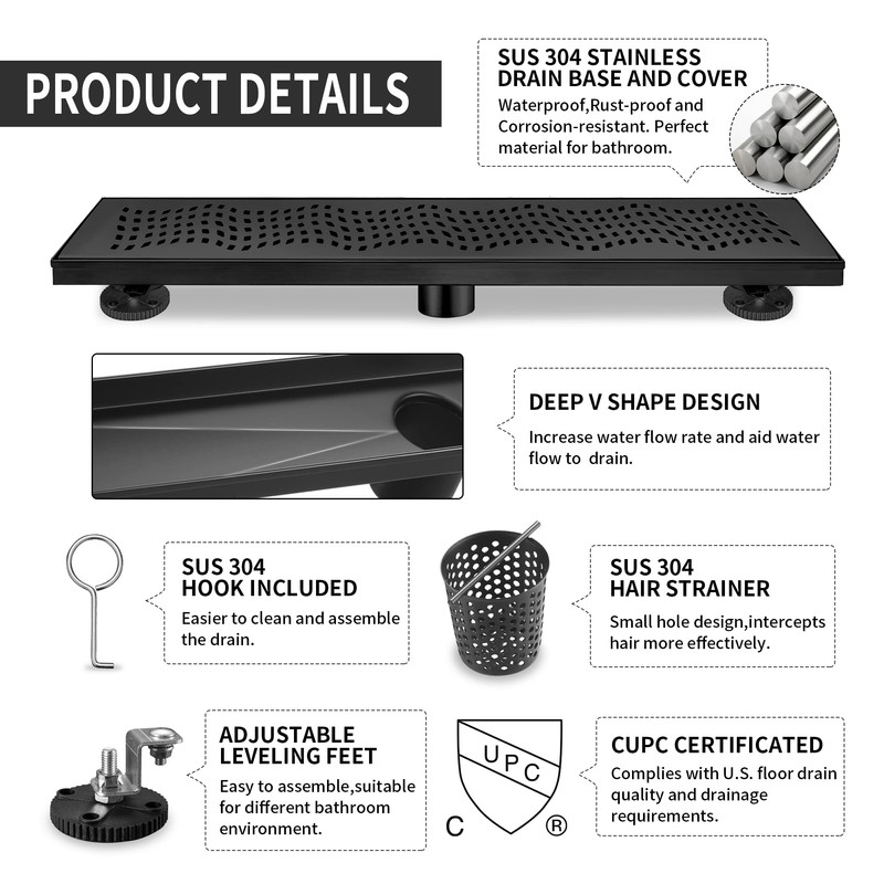 - 【Convenient Installation and Cleaning】:The linear shower drain features two height-adjustable horizontal feet, making it compatible with American standard drainage systems. The included hair filter basket effectively traps hair and debris, preventing clogs, while the removable drain cover (with a convenient hook) allows for quick and easy cleaning.