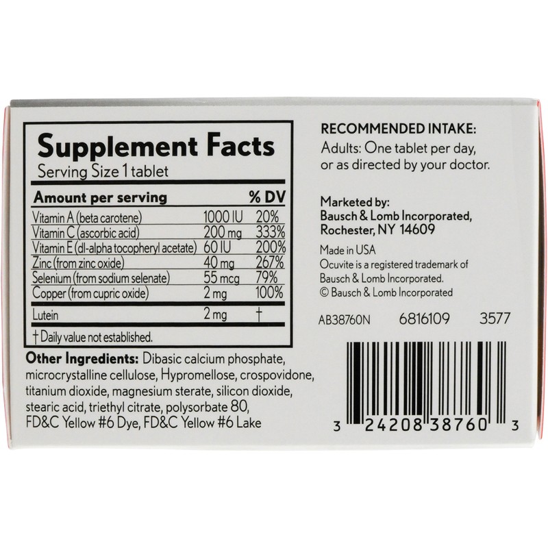 - OCUVITE LUTEIN & ANTIOXIDANTS: This eye supplement from Bausch + Lomb contains Lutein as well as other nutrients that are important to healthy eyes, including Vitamin A, Vitamin C, Vitamin E, Zinc, Selenium & Copper. Eye Nutrition for Today.