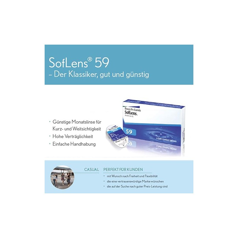 SofLens 59 – erprobte Monats-Kontaktlinsen (sphärisch) mit hohem Wassergehalt. Die SofLens 59 ist eine bewährte Hydrogel-Kontaktlinse, die speziell zur Korrektur von Myopie oder Hyperopie (Kurz- oder Weitsichtigkeit) konzipiert wurde. Die weichen Monatslinsen gleichen zuverlässig Plus- und Minus-Unschärfen aus, sind in allen gängigen Sehstärken erhältlich und für die tägliche, aber auch die gelegentliche Nutzung bis zu 1 Monat konzipiert. Das einfache Handling und der günstige Preis machen die Linsen gerade für Einsteiger zum Ausprobieren interessant. Die ablagerungsresistenten Monats-Linsen sorgen für klare, scharfe Sicht und weisen sowohl eine hohe Spontan- als auch Langzeitverträglichkeit auf. Ebenso schätzen Kunden die Soflens-Monatslinsen wegen ihres guten Preis-Leistungsverhältnisses in Markenqualität. Bewährtes Material, proteinabweisende Oberfläche mit guter Sauerstoffdurchlässigkeit. Soflens Hydrogel-Linsen sorgen daher in Kombination mit niedrigem Wassergehalt für einen angenehmen Tragekomfort im Alltag. Die Soflens-Linsenserie gehört zu den weichen Linsen, ist aber formstabiler im Material als die Nachfolgerserien PureVision und Bausch und Lomb Ultra. Bitte sprechen Sie Ihren Kontaktlinsenspezialisten darauf an, welche Tragedauer für Sie optimal ist.