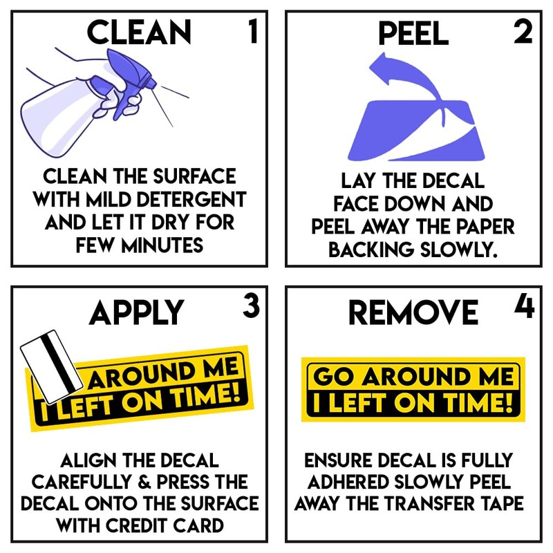 - Easy Installation: Clean the surface with mild detergent and let it dry. Lay the decal face down and Peel away the paper backing slowly . Align the decal carefully and press onto the surface with a credit card to smoothly transfer the decal to the surface. Ensure the decal is fully adhered slowly peel away the transfer tape.