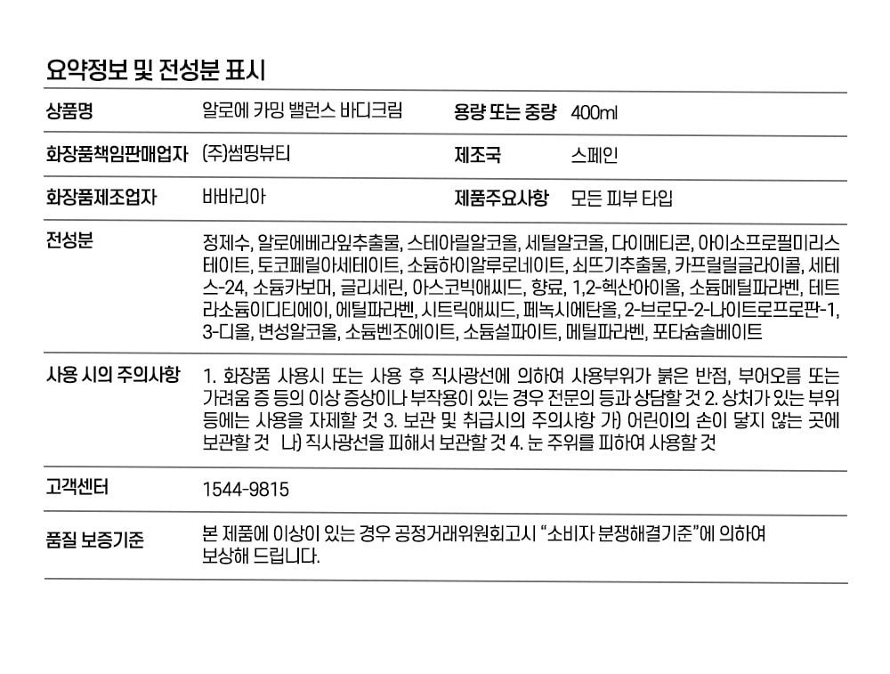 Bavaria Aloe Calming Balance Body Cream 400ml / 바바리아 알로에 카밍 밸런스 바디크림 400ml