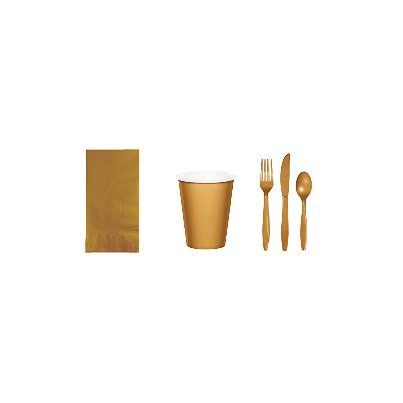 Baxters Party Bundles Bulk, Gold, 50 Count Paper Dinner Napkins, 48 Count 9 Ounce Paper Hot/Cold Cups, Heavyweight Plastic Cutlery for 48 People, Box of 242