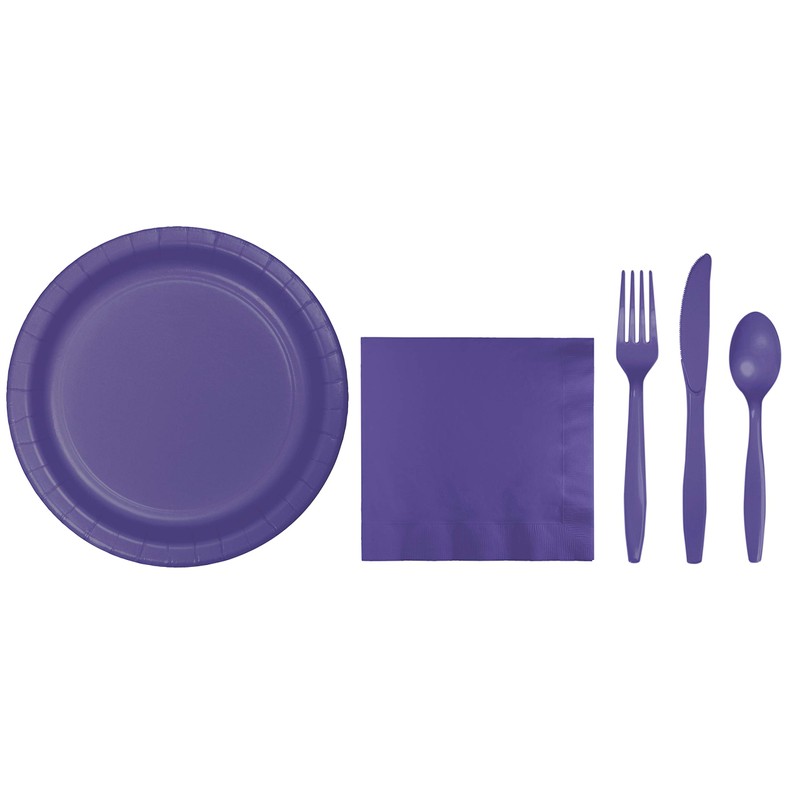 Baxters Party Bundles Bulk, Regal Purple, 50 Count Paper Luncheon Napkins, 48 Count Premium Sturdy 9 Inch Paper Plates, Heavyweight Plastic Cutlery for 48 People, Box of 242