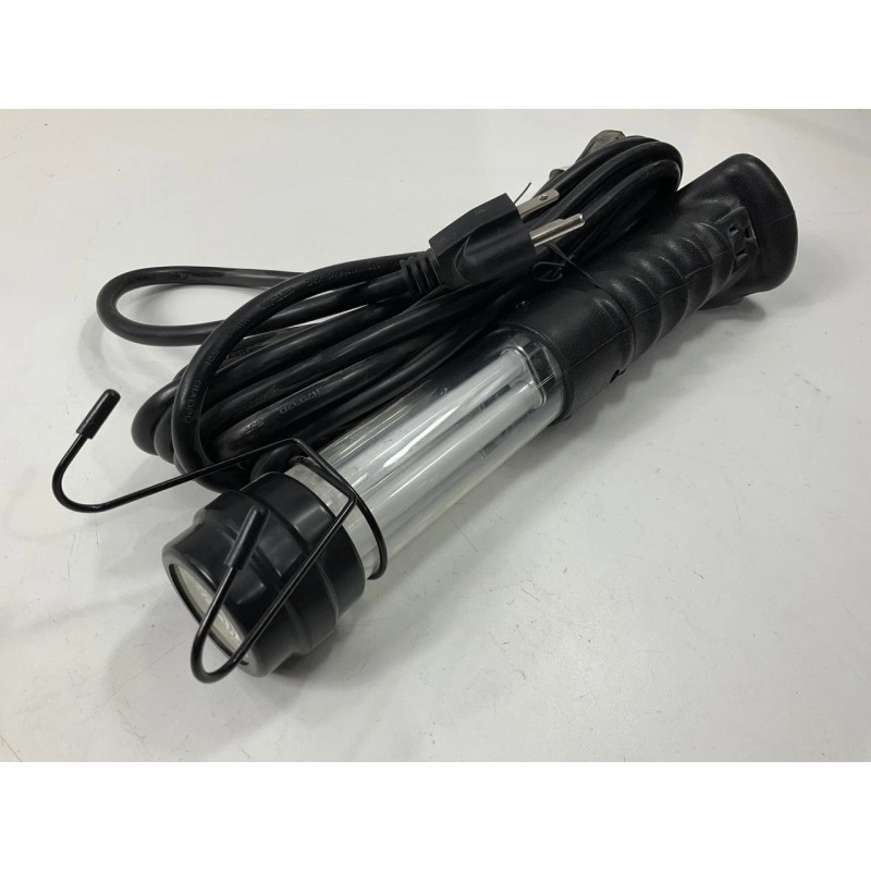 This fluorescent work light uses a single 13 watt fluorescent bulb. The amount of light produced is similar to that of a 75 watt incandescent bulb but with a daylight color to it. The handle has a natural ergonomic shape making it easy to hold and use. Built into the handle is a single 12 amp grounded Single Outlet making it possible to power another tool or device directly from the handle. The electronic ballast provides instant, no-flicker cold weather starts. The cord uses an exclusive 90 degree swivel design making it possible to set the light down for hands-free operations. Further aiding in the hands-free use of this product, are the nylon tipped double hooks. This unit utilizes a rocker style switch and has a 25 foot 16/3 SJT cord.All items are sold as shown. Since we offer free shipping we will ship the items the cheapest most cost effective way possible.