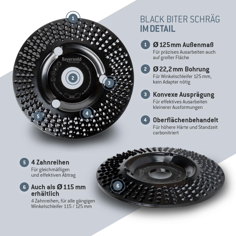 - Perfect fit – Our rasp disc "Bayerwald Black Biter" (diameter 125 mm) fits all standard angle grinders with a diameter of 125 mm and a bore of 22.23 mm