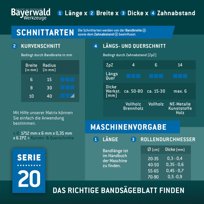 Often only bands from 0.36 to 0.5 mm are released by the manufacturer. With restrictions, tapes from 0.65 mm can also be used depending on the machine type. Due to the higher stiffness of the tape, it can increasingly lead to band breakage.