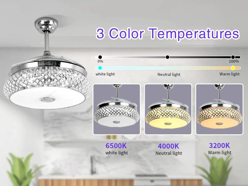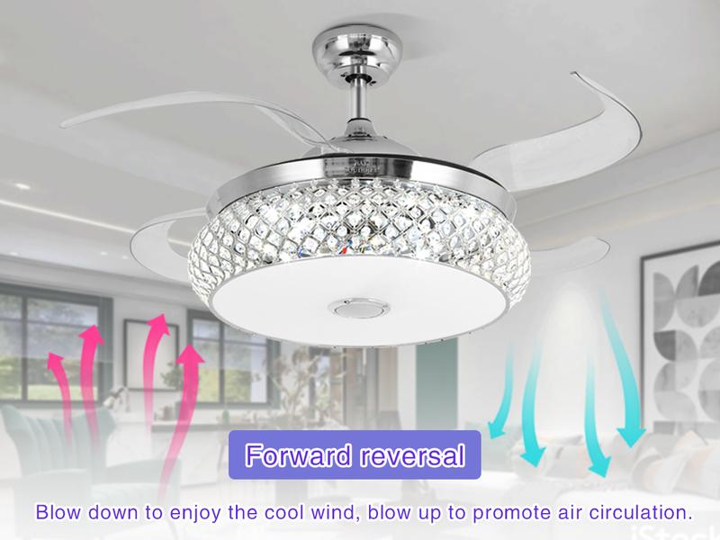 • 【6-Speed Reversible Retractable Ceiling Fan】: Retractable Bluetooth Ceiling Fan, thickened acrylic transparent 4-leaf retractable blades, the 6-speed fan supports forward and reverse rotation. the fan blades are rotating forward to provide you with strong cold air in hot summer, and in winter Ceiling fans reverse to provide fresh air throughout your home.
