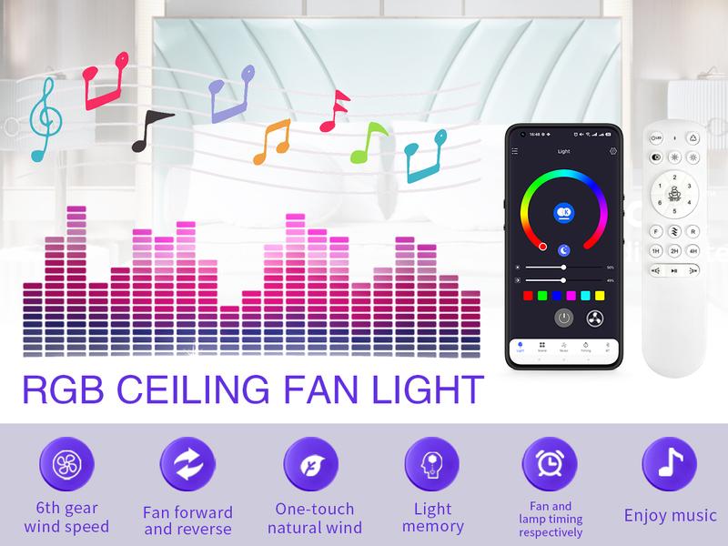 • 【Multiple Color lights Modes】:Change the color of the ceiling fan light through the app, there are 15 colorful lighting effects to choose from,At the same time, the brightness and color temperature of the LED light can be adjusted through the APP.Turn on colorful lights and speakers when gathering with family or friends to make the party even more fun.