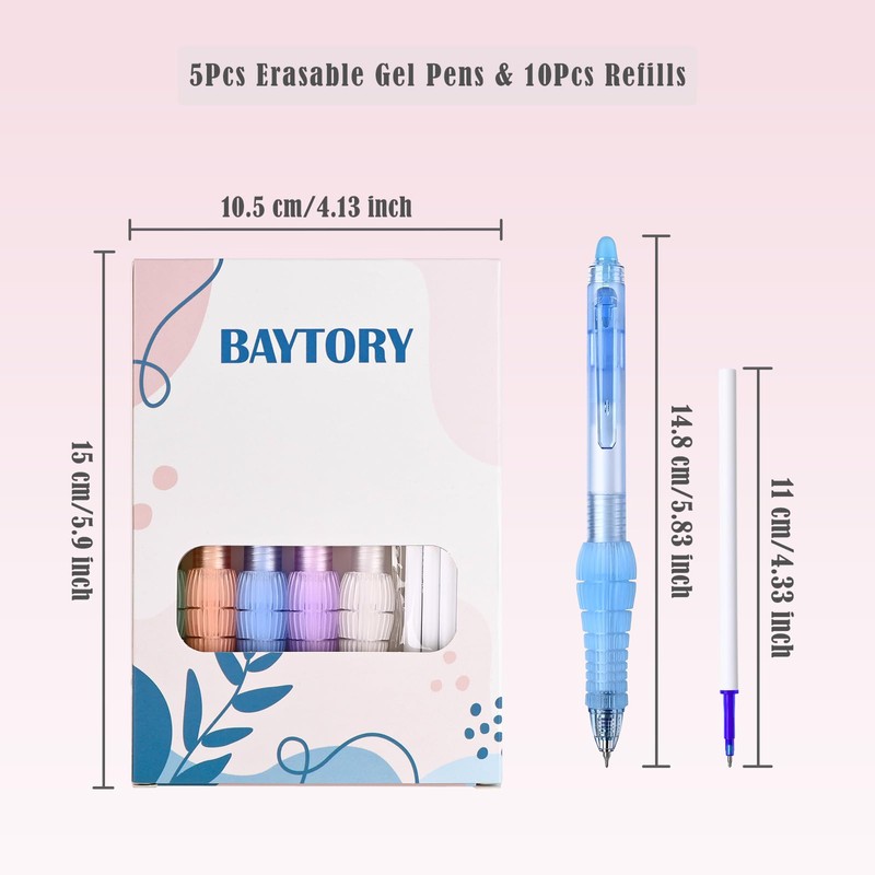 BAYTORY 5 Pcs Erasable Gel Pens, Fine Point 0.5mm Black Ink Erasable Pen with 10 Refills, Comfort Grip Writing Pens with Erasers, for Office School & Home Supplies (Blue Ink)