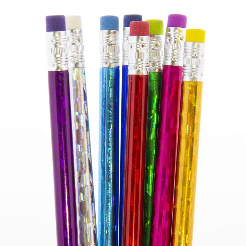 - ⭐ METALLIC LASER FOIL WOOD PENCIL w/ ERASER. Each pack comes with 8 wooden pencils. Features laser foil barrel for fun writing experience. Easy to erase and easy to sharpen with any quality sharpener.