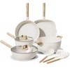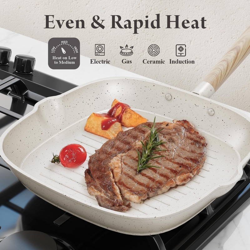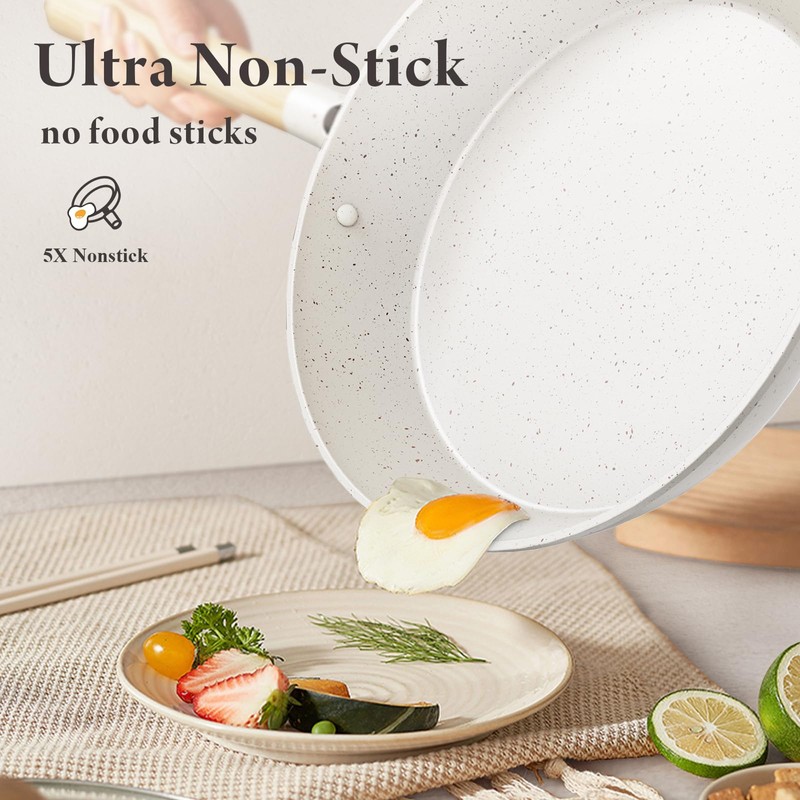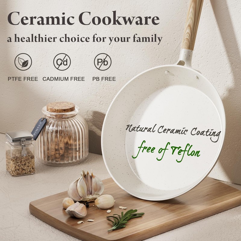 Large-Capacity Nonstick Cookware Set: This set includes an 11-inch frying pan, 11-inch grill pan, 3-quart (10-inch) sauté pan, 2.7-quart (8-inch) saucepan with lid, 5.3-quart (10-inch) stockpot with lid, utensil set, and pot protectors. Superior Nonstick Performance: Enjoy five times the nonstick efficiency with minimal oil. Your meals will effortlessly slide off the surface every time. Healthy Ceramic Coating: Our pots and pans set is made from natural ceramic and is free from PFAS, PTFE, PFOA, lead, and cadmium. Unlike Teflon-coated cookware, our ceramic cookware set emits no toxic fumes even when overheated, providing a safer cooking experience for your family. Easy to Clean: Simply rinse or wipe, and your pots and pans set will stay spotless, maintaining its pristine appearance effortlessly. Even Heat Distribution: The ceramic cookware set ensures rapid, even heating without hot spots, allowing your food to cook uniformly whether you're boiling, simmering, or reheating. All-Stove Compatibility: The thickened, expanded magnetic base guarantees that this pots and pans set non stick works perfectly on all stovetops, including induction. Built to Last: Made from reinforced aluminum, this durable white pots and pans set stands up to everyday use without sacrificing performance, ensuring long-lasting quality.