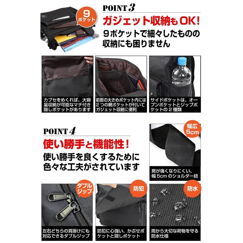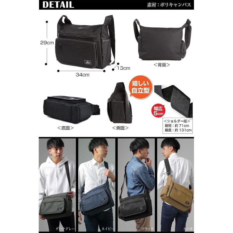 - The 2.0 inches (5 cm) wide shoulder strap is designed to prevent shoulder pain even when worn for heavy loads or long periods of time. The adjustable shoulder strap is long, so it can be worn diagonally. It is also a great feature that makes it stand up on the floor and does not fall over