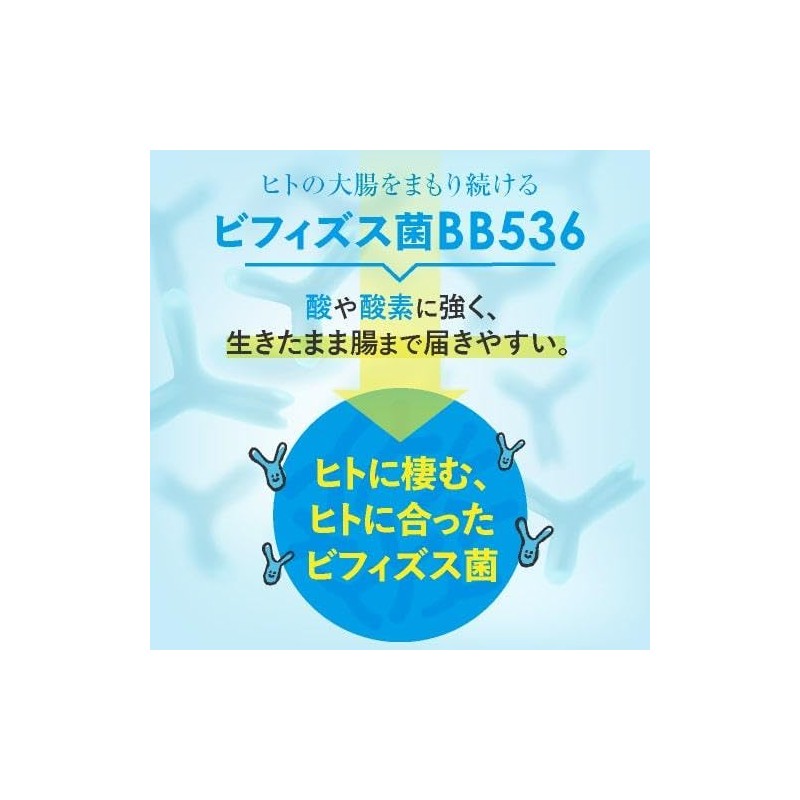 - 【ビフィズス菌BB536】ビフィズス菌BB536は他のビフィズス菌種と比べて酸や酸素につよく、生きたまま腸まで届きやすい。健康な乳児の腸内から発見され、成人の腸内にも多く棲んでいることが分かっています。そのため、ビフィズス菌BB536は『ヒトに棲む・ヒトに合ったビフィズス菌』と考えられています。