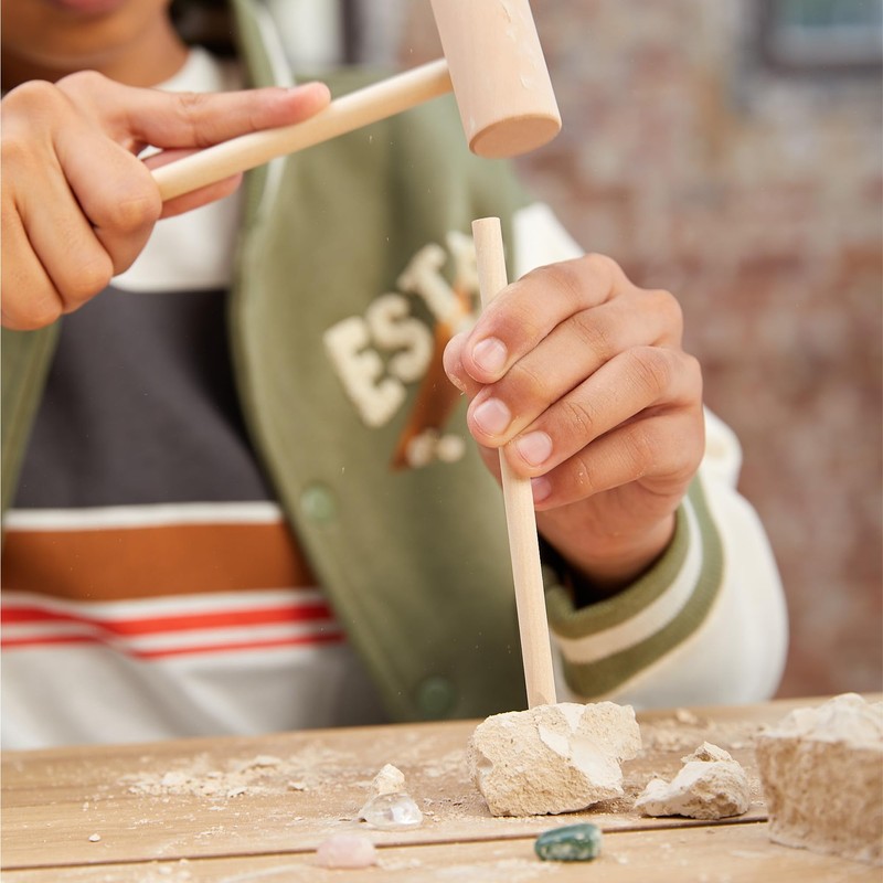 - REDUCE, REUSE, REPLAY: Discover how to work like a real-life geologist and reuse the wooden mallet, chisel, and brush to excavate in nature!