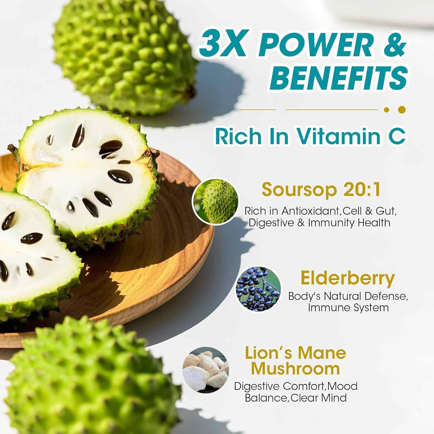 - Active Ingredients: Graviola, Vitamin C (Ascorbic Acid), Graviola Fruit Extract, Elderberry Extract, Lion's Mane Mushroom Extract
