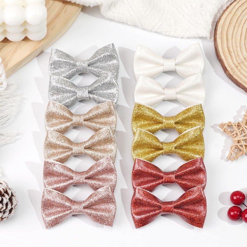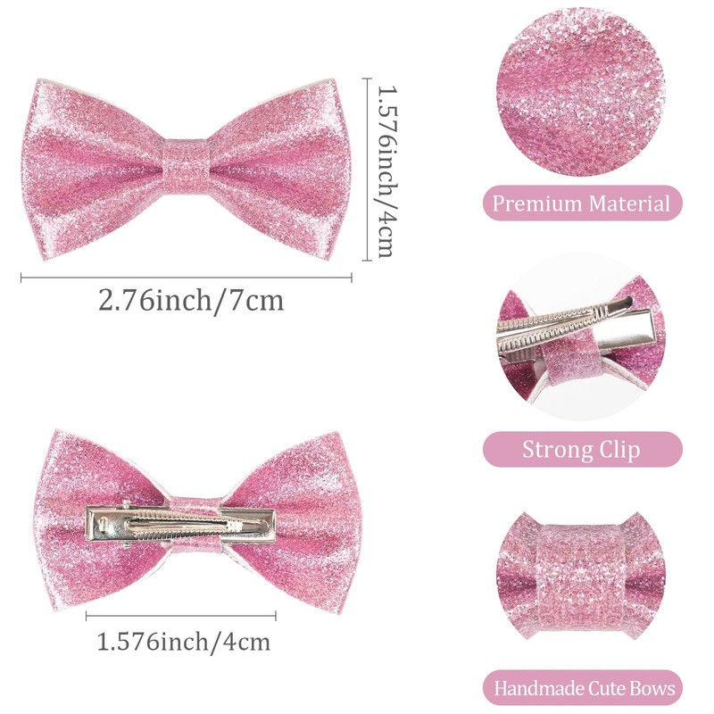 - Size: 2.75inch hair bows, made of high-quality glitter leather material. All ends have been neat cut to prevent fraying. Beautiful and lovely to wear. Use them to keep hair away from your little one's eyes or to add a cute touch to plaits, ponytails, and buns