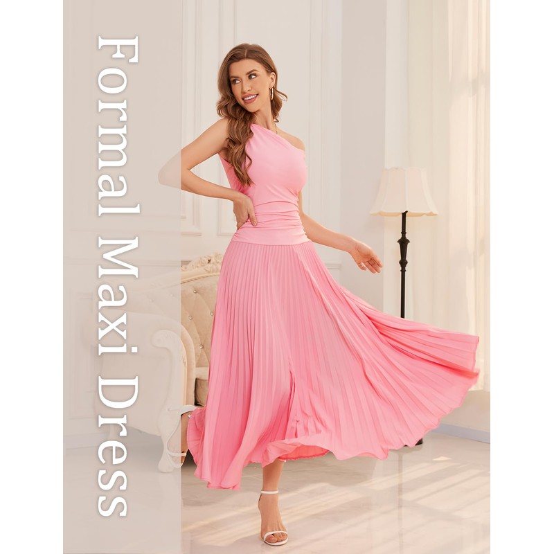 Bbonlinedress Pink Maxi One Shoulder Prom Cocktail Summer Pleated Dress Women Wedding Guest Bridesmaid Formal Long Party Dresses Pink M