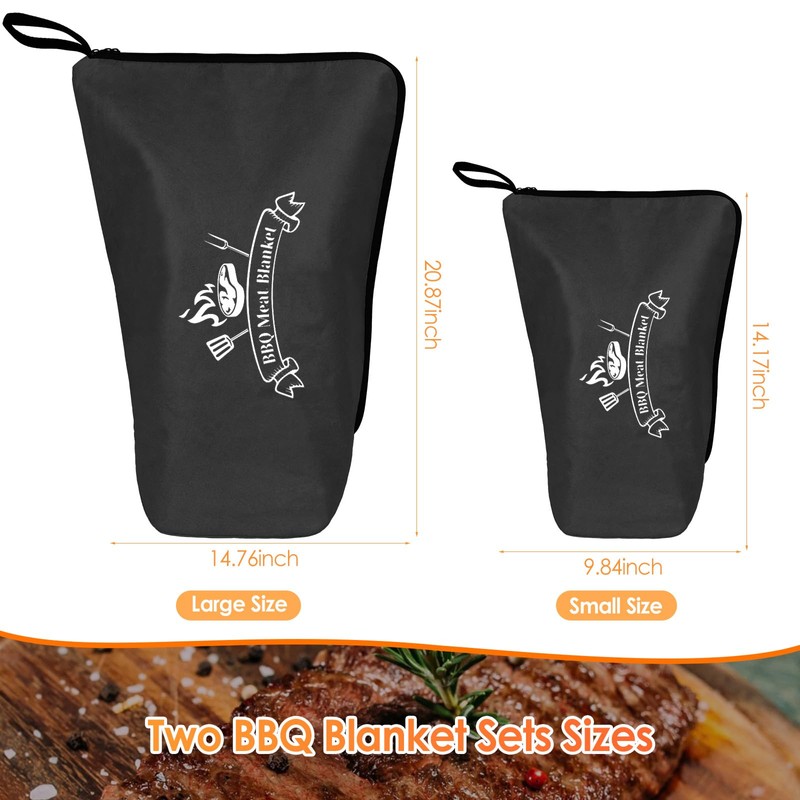 - 2 Sizes, Endless Uses:Say goodbye to one-size limitations! Our BBQ Blanket Combo includes two sizes—21 inches and 15 inches. A 21-inch large blanket for hefty cuts like brisket, ribs, or whole chickens, and a 15-inch compact blanket for smaller meats like burgers, steaks, or fish fillets. Ideal for grilling, camping, or picnics, this duo eliminates juggling single-size bags. Use separately or together!