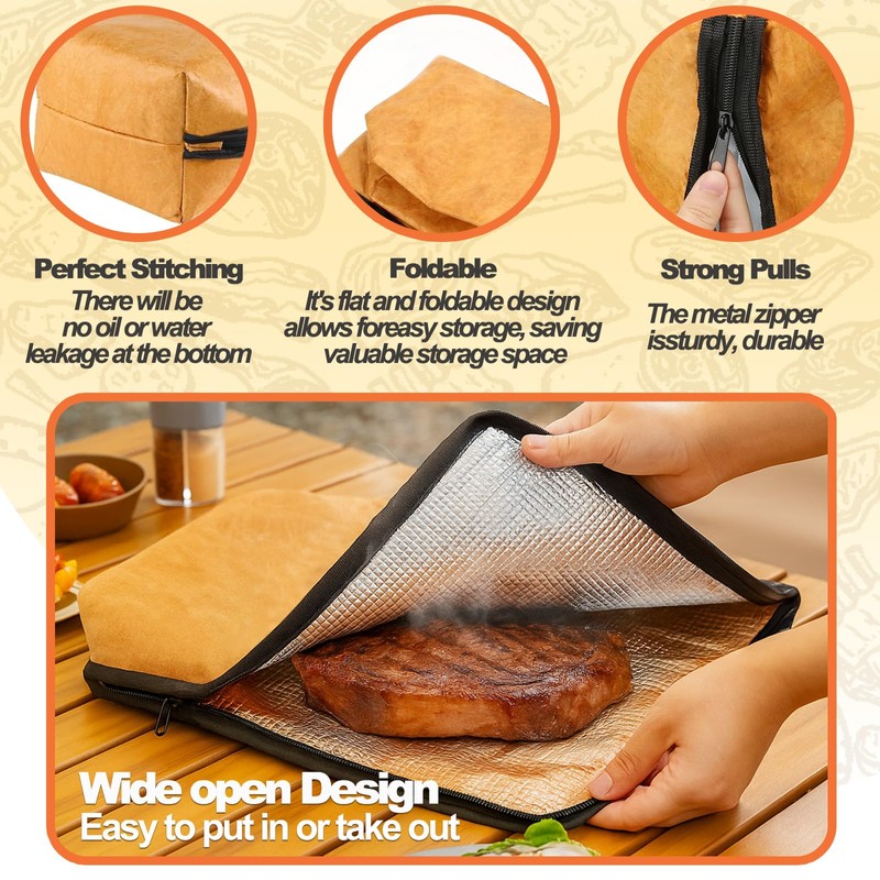 - Heavy-Duty Zipper + Leakproof Inner Liner – Seals in juices, prevents spills, and resists grease.