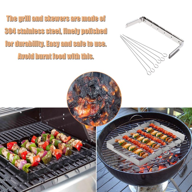 - 【Food Grade Material】Grills and skewers are made of 304 stainless steel, finely polished and durable. Easy and safe to use. Please note: Oil brush colour random.