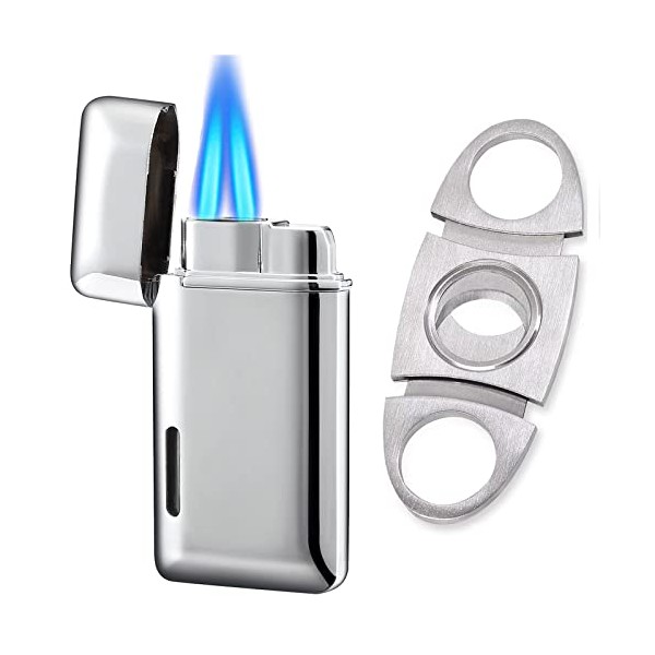 Bbsisgo Torch Lighter, Cigar Cutter and Lighter Set, Double Jet Flame Butane Lighter with Visible Window, Refillable Windproof Lighter, Gifts for Men(Sold Without Gas) (Silver)