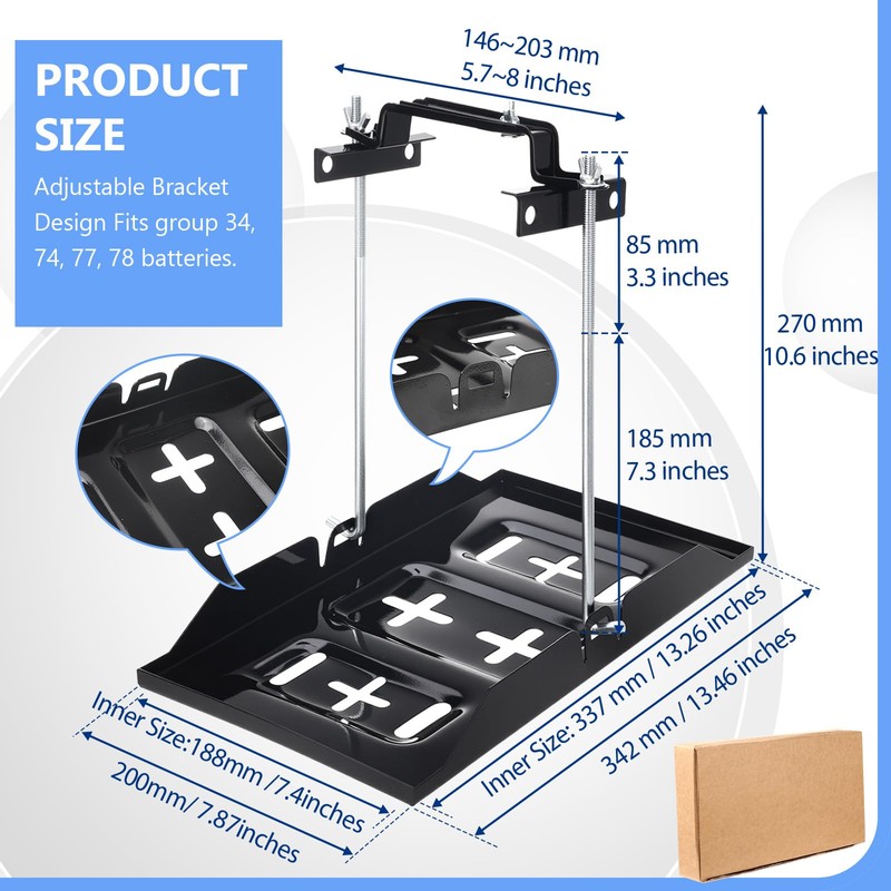 - Versatile Universal: 10.6" J-bolts to accommodate battery width adjustment clamping range of 5.7-7 inch, 13.4" battery tray: 7.4 " width, 13.3 " length, fits 65, 48, 94R groups; One kit for your SUV and another for your sedan