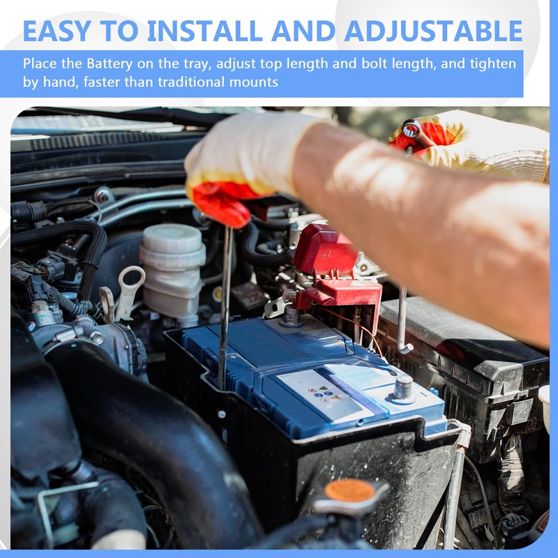 - Easy to Install: our car battery holder bracket kits are sized for a tight and secure installation, and each kit can be installed in minutes, without a wrench: just place on an 13.4” tray, adjust top length and bolt length, and tighten by hand, faster than traditional mounts