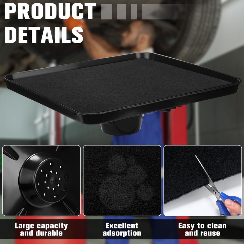 - Oil Drain Splash Pad Quality: Oil drip pan and splash pad are respectively made of flexible plastic and foam materials, it is large enough to avoid oil dripping onto the floor during maintenance, prevent damage to the floor, and also suitable for oil change, drainage and more
